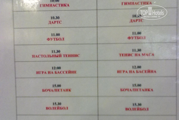 Анимация. Массовиков-затейников заводными назвать не получится. Всё как-то уныло и безжизненно. В то же время на приложенной фотке можно увидеть расписание мероприятий, которое исправно соблюдалось. Танцы до утра тоже не предвидятся, хотя это больше зависит от масштаба лично Вашей компании, музыку и алкоголь Вам обеспечат.