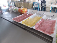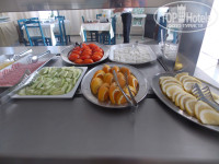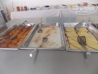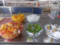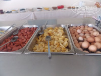 Еда не очень разнообразная, выложу фотки. Салат фруктовый был каждый день, консервированные персики, колбасы 2 вида, сыр, мюсли всякие, жаренные сосиски (по-моему) картофель печенный, булочки и основное блюдо менялось и повторялось каждый 3 день. ЭТо каша рисовая с корицей, либо омлет, либо помидоры какие-то печенные. Булочки с изюмом, либо рогалики с сыром, ааа еще пончики!!!!))) Ну, как все уже сказали наесться можно вполне, но все одно и то же. Чай, кофе и сок на завтраке бесплатно!