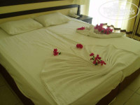 Заселились в отель быстро. На рессепшене у портье Аладина (он чуть-чуть говорит по- русски) попросили номер с видом на бассейн во внутренний дворик, на 1-ом этаже. Комната была №4107 (единственная у которой на балконе росли красивейшие цветы) и в номере работало всё. Убирались у нас каждый день, смена полотенец и постельного белья была тоже КАЖДЫЙ день. И постоянно делали из одеял на кровати разные бантики, кораблики…посыпали их живыми цветами (и это без всяких чаевых). В номере: кондиционер (над входом в комнату с пультом и встроенными часами с таймером), 2 кровати (или одна двуспальная), 2 тумбочки, раскладное кресло, трюмо с ящичками и зеркалом, мини холодильник с питьевой водой в бутылках (которые, каждый день докладывают. В день по 2 шт.), телевизор с ≈25-ми турецких и немецких каналами, также имеются 2 русских канала ОРТ и РТР планета. Показ различных сериалов отстает от московского, но Новости транслируют без задержек. Присутствовал шкаф с вешалками, сейф за доплату. В шкафу имеются пледы, для тех, кто замерзает. В с/у мыло встроенное есть всегда, шампуни приносит обслуга. Да, и фен не тащите, там он тоже есть, довольно мощный 1100 W мощности. Ванная комната действительно с ванной, туалетом, раковиной и большим зеркалом в полстены. Есть два телефона: один в комнате, другой в ванной.