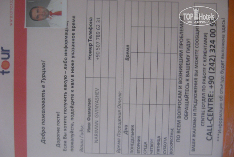 НО!!! Был один, НО очень непрятный момент... Мы отдыхали от "Аnex-tour", от фирмы в отеле был гид - представитель Anex - Нариман Гвиняшев (Nariman Gvinyashev). Этот эпизод мы вспоминаем с обидой и негодованием. Вместо того, чтобы быть нашим помощником и координатором, он стал человеком, испортившим нам впечатление от всего в самом начале, скажу более - он нас напугал... Про отель и местные особенности (а мы сказали - что приехали впервые, впечатлены природой, людьми) нам ничего не рассказал. Цель Наримана - выбить средства на местные экскурсии и ВСЁ. Когда мы в очередной раз сказали ему при первой (и последней) беседе,что сегодня ещё осмотримся , что не готовы заказать местные туры, начались угрозы... "Если узнаю, что поехали сами или с др. фирмой - позвоню в полицию, вам, мэм, заблокируют ваучер и будете неделю плавать только в бассейне, из отеля не выйдете. 15 минут думайте и говорите - куда едем". Мы были в шоке, от наглости этого засранца мы просто отупели на время. Потом пошло откровенное хамство в довольно издевательском тоне... даже вспоминать не хочется - противно. Считаю, что это было ОСКОРБЛЕНИЕ, УЩЕМЛЕНИЕ НАШИХ ПРАВ И ОГРАНИЧЕНИЕ СВОБОДЫ. (Любой турист в любой стране мира имеет право сам осмотреться и поездить по достопримечательностям. Что мы и сделали ИЗ ПРИНЦИПА. На местном транспорте посетили Кемер и Фаселис). Хотели бы в Лариссу ещё поехать и с ANEX-TOUR cотрудничество продолжили бы, если бы не попадались такие бессовестные хамы. Отельные гиды от др.фирм работали чудесно - мы специально послушали как встречал туристов Пегас-туристик и Тез-тур. Было завидно...