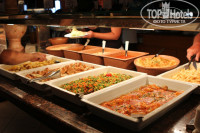 Получив первое моральное удовлетворение во время купания, смыв соленую воду под душем на пляже, голодные и довольные идем на ужин в главный ресторан. И тут я влюбилась в этот отель еще больше). Как человек, для которого кулинария - это хобби, я просто расстаяла, увидев. какое кол-во зелени, разных салатов, заправок, составляющих ингредиентов, чтобы самостоятельно приготовить свой салат, стояло на столах. От закусок, до вторых блюд - огромный выбор, но поражало не разнообразие. а качество. Забегая вперед, скажу, что вкуснее кухни, чем в нашем отеле, мы не пробовали ни в одной местной таверне ни на Крите, ни на Санторини. Если уж в Creta Maris Beach Resort 5* что-то готовили, что оно было превосходного качества. Курица. говядина, ягненок, свинина - у мужа текли слюнки каждый ужин, выпечка - пальчики оближешь, даже я не смогла удержаться, позволяла себе кое-что попробовать. Да были небольшие "но", но на форе плюсов эти но были не значительны, это отсутствие первых блюд ( хотя тут винить отель нет смысла, ибо не характерны первые блюда для Греции), отсутствие как таковых морепродуктов, кроме рыбы, однако вся рыба, а ее было много в разнообразных соусах, формах и видах, она на наш вкус показалась какой-то одинаковой и пресной, что ли, т.е. ничего особенного, что вызывало бы желание ее съесть).