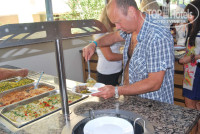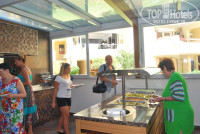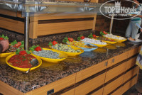 Питание очень хорошее. Всегда разнообразная зелень,овощи.Салаты несколько видов. Соусы,солености.Супы-пюре два вида,достаточно вкусные.Пирожное видов 20 , утром выпечка. Курица в разных видах,рыба-пробовали и тунца, и маринованные анчоусы,скумбрия,какая то еще "местная" рыбка. Говядина была обычно в тушенном виде с картошкой или баклажанами.Еда не острая. Еще была индюшатина.Каждый вечер делали гриль на улице. Кормили 5 раз в день! Кому мало завтрака ,обеда и ужина))) можно было перекусить шаурмой или гамбургерами.Бар работал по-моему с 10 утра и до 22 ночи. алкогольные напитки-водка,вино,пиво и спрайты,фанты. Очередь была только во время ужина и то небольшая. Кто хотел напиться тем это удавалось)))).Анимация по средам и воскресеньям-концерт и танцы.