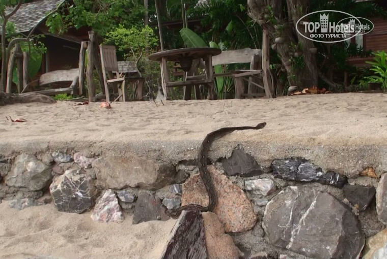 Расположение у отеля своеобразное. Конечно пирс и пристань в 300м от отеля никак его не украшают. И пляж в том же ЧармЧури в 5 минутах ходьбы в соседнем отеле намного красивее, тише и чище. Но, во-первых Sensi расположен гораздо удобнее, поскольку прямо от него начинается туристическая улочка и вся «движуха» с ресторанчиками-лавочкам-дайвинг-центрами и т.п. Во-вторых, пляж все же очень тщательно убирают и вода очень чистая без обычной для близкого порта мазута и мусора. В третьих пляж, да и вообще порт располагается над роскошным живым рифом и даже затонувшим кораблем, что есть рай для любителей поплавать с маской. Прозрачность воды потрясающая, огромные стаи непуганых рыб, скаты, тригеры, акул вот правда в отличии от Пхи-Пхи, замечено не было. В третьих, территория отеля огромна и скорее напоминает хороший ботанический сад с огромными живописными валунами, окультуренными джунглями и роскошным бассейном. Террасы огромные, прямо по ним носятся белки, вечерами орут жабы, а над головой практически под любой крышей висят пятнистые гекконы с локоть размером. У нас над террасой в бунгало их лазило штук пять. С утра на пляж видимо по трубе как-то выползла и змея метра полтора длиной, фото прилагаю. После попыток отпихать ее подальше от нашей пляжной хижинки, под которую она собиралась залезть, а змеюка искусала и забрызгала ядом веник и совок которые я для этого использовал, вышел все же видимо «штатный змеелов» отеля с крючковатой палкой и отволок ее подальше в джунгли.