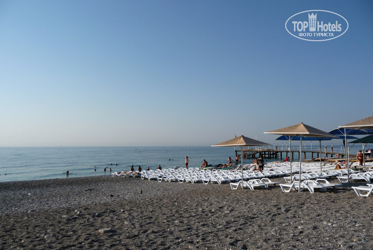 Отель очень понравился! )) Расположен прямо у подножья горы, поросшей сосновым лесом.. Живописное место! Мы жили в номере на четвертом этаже, вид был на соседний отель, справа гора, слева даже виден кусочек моря! )))) До пляжа минут десять ходьбы не быстрым шагом.. Пляж у отеля небольшой, лежаки стоят совсем близко друг к дужке.. Поэтому мы предпочитали загорать и купаться немного поодаль, на длинной полоске дикого пляжа! Море чудесное, чистое!! )))