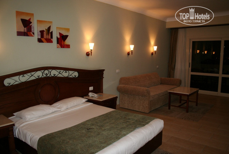 Размещение. Номера для Египта вполне приличные (фото прилагаю). Повысить оценку не позволяет то, что, реально, номер на настоящую "пятерку" не тянет. Так, по мелочи: дует через щели в двери и балконного стекла, душ держится не очень крепко и т.п. Но и ниже ставить не буду - повторюсь, для Египта вполне нормальные номера. Отдельная претензия ниже будет к туроператорам (вообще ко всем). Еще плохо было наличие вони канализационного типа в откруге всего корпуса, почти каждый день. Корпус слева от ресепшена, если стоять лицом к ресепшену, со стороны въезда.