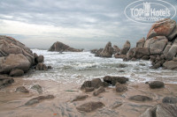 Пляж около километра длиной, песочек белый мелкий, с одной стороны - камни, с другой стороны - дикий пляж с какой-то стройкой. Попрошаек и торговцев нет. Пляж на три отеля, но народу никого, поскольку волны большие и особо не поплаваешь. Плюс спасатели бдят, чтобы никто далеко в воду не заходил.