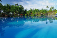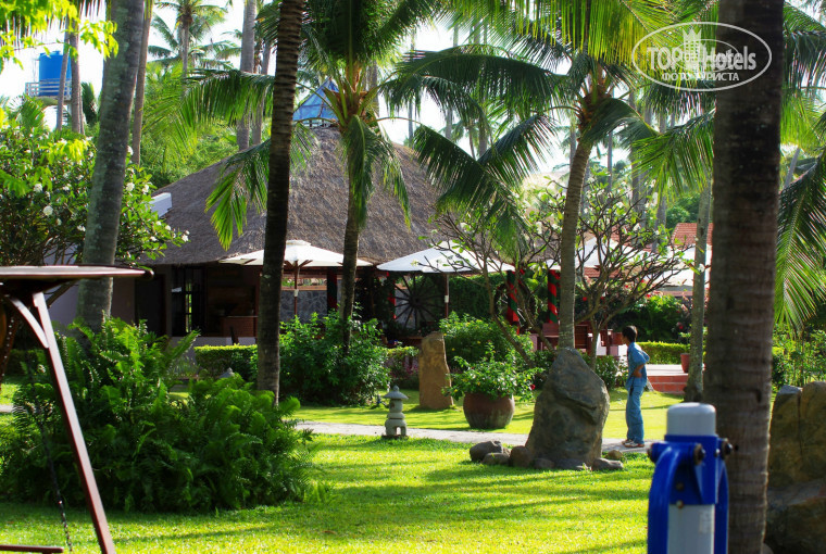 Территория отеля – это просто песня. Выше всяких похвал! Мы предпочитали ходить босиком. Отель – это ухоженный, вылизанный парк, где, кажется, каждую травинку садовники заботливо укладывают на ее собственное место. Ступни ног утопали в траве, словно в пушистом ковре. Все буквально пропитано тонкой изысканной красотой. К сожалению, нет у меня таланта Гоголя, чтобы описать территорию отеля: цветущие деревья, огромные вазы с лотосами….Кроме гостей отеля и персонала, на территории живут белки, ящерицы, птицы. С наступлением темноты на охоту за насекомыми выходят лягушки. Вьетнамцы свято верят, что от прикосновения к ним у человека будут расти бородавки и лягушек не любят.