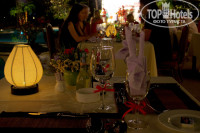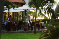 Ресторан в отеле находится прямо на берегу. Кто-то предпочитал кушать внутри помещения, но мы завтракали снаружи. Очень приятная мебель красного дерева. У нас были только завтраки. Поэтому могу рассказать о том, чем кормил отель своих постояльцев по утрам: повар жарил омлет, или глазунью по желанию, с наполнителями (лук, томаты, сладкий перец, колбаса). Второй повар занимался супом. Вот любят в Юго-Восточной Азии покушать супчик по утрам! Наполнителей и соусов для супа было штук по 10 каждого. Дальше стояло несколько мармитов с беконом, маленькими сосисечками, кашами, рисом, овощами. Мармитов было не много – 8, или 10. В каждом два блюда. На отдельном столике обязательно свежие овощи, паштет и японские суши с полагающимися соусами и приправами с одной стороны, а с другой - все, что нужно для любителей мюсли. И еще один стол - с хлебом, печенюшками, печкой для тостов и фруктами и соками. Папайя, ананас и, драконье сердце и арбуз были постоянно, остальные менялись. Всего выкладывалось примерно до десяти видов фруктов. Каждый день были свежее выжатые соки - арбузный и ананасовый.