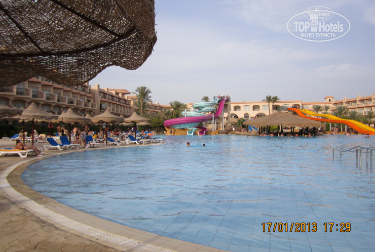 Перелет был тяжелый, из Самары до Хургады 4,5 часа. Может мы не прмивыкли, может от того, что встали рано утром не выспались. Короче прилетели и Египет нас встретил холодным сильным ветром. У нас всё "опустилось", как в прямом так и в переносном смысле. Еще одно не удобство это покупка визы. Очередь была, но всё живо и не очень заметно прошло. На бумажке написали по англ. фамилии, номер паспорта, Россия. Не сложно, помощники из сограждан были. Конечно есть предложения у египтян за энную сумму без очереди, но это лишнее. Даже бабуськи там справлялись. Добрались до автобуса. Гид- египтянин сказал, что за 25 минут доберемся до отеля. Итог 1 час. Заехали по пути в 3 отеля, наш последний. Когда выбирали путёвку ориентировались на сумму, это была ошибка. Нас заселили сразу. Но вид из номера был на теннисный корт и строящийся серый, мрачный отель. Моря не видно. Вопрос с другим номером решился одномоментно с первого обращения в рецепшн. Пришлось доплатить 90 баксов + 10 с верху с просьбой на бассейн. Итог - на 2 этаже в 3 корпусе с прекрасным видом большой комнатой, всё работает. Убираются каждый день, напитки спрайт кока-кола фанта соки 2 кор. каждый день поставляют, плюс воды 1,5 литра 2 бутылки. Шумоизоляция не очень. Из коридора слышно всех, но нам не мешало. Наоборот с утра просыпались и на завтрак. Еды всякой, любой хватало. Напитки стандартные вино красное и белое, пиво. И газировка, и кофе, чай. Да завались. Напейся хоть в хлам. Видел парочку мужчин, ну не в хлам, но хорошие в обнимку проходили. Кстате в отеле только из России, Украины, Белоруссии и парочку одну видели с Прибалтики. Немцев и англичан нет (может в этом сезоне). Ну и МОРЕ. Да тёплое, бодрящее море в январе. На пляже жарко, можно обгореть, если кремом не намажешся. Чистое (в турции в Средиземном мутном ни чиго и ни кого не видать), а здесь как в аквариуме среди рыбок. Без масок делать нечего. Я еще и ласты привёз очень удобно. Тапочки каралки можно в соседнем с отелем магазичике купить. Супруга приобрела 4 пары за 15 дол. Без них я палец на ноге порезал об каралы. Но это меня не остановило, я вновь и вновь плавал. Слева от старого баркаса еще разнообразнее рыбы, мурена, змея полосатая, скат около 1,5 метра на дне лежал. Мы его пытались спугнуть камешками, бесполезно-видно спал. Маленькие камбалы, морские ежи и звёзды. Впечатлений выше крыши. Крабики бегают по пляжу в ракушках. Кому мало можно в сископе осмотреть дно за отдельную плату. Територия большая зеленая, кому мало можно прогуляться по набережной, (на велике, на электровелике, на электоромобиле за отдельную плату). Мы пешком. Там есть магазинчики, где сторговаться можно хорошо. Товар везде одинаковый. Вечером развлекаловка в амфитеатре. Аниматоры нам понравились. Работают на все 100% + Приезжают другие артисты. Танцы хороши, хорошо танцуют. Ну и дискотека до 3 ночи. Места мало, но рядом строят еще один комплекс, с виду похож на танцпол. Очень понравилась живая музыка. Ансамбль гитара, бас гитара ... Хорошо пел на английском все хиты. ВСЁ, ВСЁ отлично. Ездил в Луксор и Дендеру очень позновательно (с 5 утра до 8,30 вечера). Гид хороший Мухамед. Правда приходится привыкать к их говору. Он старается это видно. Впечатлений много, отдохнули хорошо. Спрашивали у других где лучше: в Турции, Шармальшейхе или здесь. Лучше всего здесь именно в этом отеле по обслуживанию, по морю. И нам по