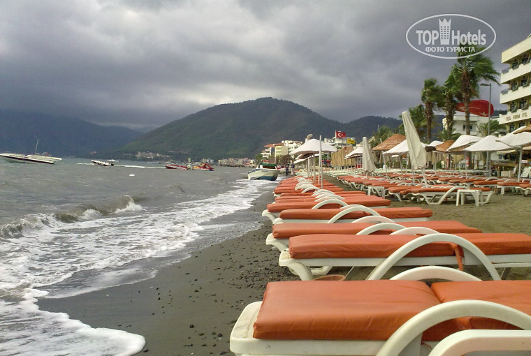 отдыхали с подругой в октябре брали тур по принципу что подешевле, получилось на неделю 13 т на одного, до этого отдыхала только в 5*, первое впечатление на 4, разместили быстро, номер хороший. все чисто и все в рабочем состоянии, персонал понимает по русски немного, так как был конец сезона ребята в баре нам так показалось уже притомленные туристским сезоном)) тем более от русских туристов) в отеле было много русских туристов даже большая часть! молодежи тоже хватало, из 7 дней 4 был дождь, спасло только то что была хорошая компания из тех кто отдыхал в отеле на последнем ужине сидели все за одним большим столом) Очень радушно отнеся управляющий отеля, так как было закрытие сезона был щедр и угощал платным алкоголем из бара, дал воспользоваться своим компьютером в кабинете, был очень вежлив и обходителен, ходили на бар стрит, очееень понравилось обратно прошлись пешком, на улице спокойно ни кто не пристает, если сами не захотите))Отель находится рядом с пляжем, лежаки платные, но мы проходили подальше по берегу на купленых плетеных ковриках лежали, пляж не очень чистый, море прохладное,Ходили гулять по городу дошли до амфитеатра, если подняться на самый верх то видно панораму первых линий и моря. Рядом много магазинов, ездили на Памуккале советую всем может долго ехать но оно того стоит!! даже не смотря на плохую погоду хочу еще раз там побывать.Мармарис оставил впечатление "синдром детского лагеря" хочется возратится туда снова и снова, отель тоже очень понравился за добрую и уютную атмосферу, и еще н смотря на то что отель рядом с набережной нам не было слышно громкой музыки мешающей спать.