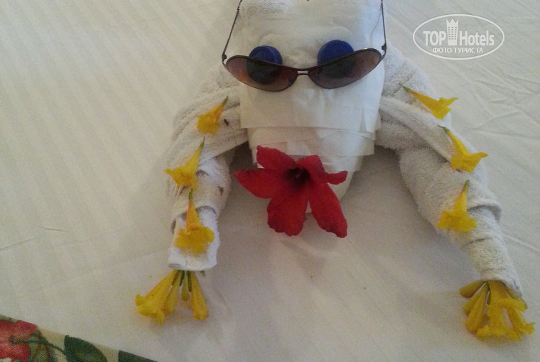 Номер: как уже писала,номер был с видом на бассейн с баром,дискотеки каждый день,но нам музыка не мешала,хотя слышно её сильно.В номере чайник,чай,кофе,сахар,вода в бутылках,газировка и соки - тоже бесплатно.Приносят утюг,позвоните на ресепшн и через 10 минут утюг ваш - бесплатно.Убирали номер очень хорошо,каждый день делали фигурки,показывала фото фигурок и все в восторге,говорят,что не видели ещё таких.В номере большой телевизор и кстати много русских каналов(обычно бывает меньше).