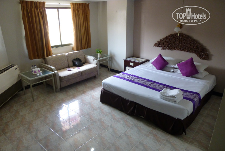 Отдыхали с друзьями в мае. Отель находится в центре, между второй и третьей улицей, все рядом. Номер брали DELUXE, достаточно просторный, убирались каждый день (хоть и не оставляли чаевых), все работало исправно. В номере был сейф, ТВ плазма, фен, холодильник, кондиционер, трюмо, большая кровать и маленький диванчик. В ванной комнате душ, достаточно чисто и уютно. Вид из номера был на окрестности. Депозит составлял 1000 батт, вернули без проблем. Завтраки шведский стол, сытные, вкусные, но достаточно однообразные. На ресепшене выдавали пляжные полотенца под расписку. Персонал приветливый. Не смотря на то что отель находится в достаточно шумном месте и жили мы на втором этаже, спокойному сну это не помешало, в номере была хорошая шумоизоляция. Бассейн не большой, чистый, есть лежаки, бар к нему тоже прилагается, поэтому со своим нельзя. Минусом этого отеля является отсутствие балконов, маленькая территория, и кондиционер который работает только в 2 режима ВКЛ. и ВЫКЛ., если на ночь оставляли включеным, на утром обязательно простывали. А так в принципе неплохой отельчик, твердая тройка!