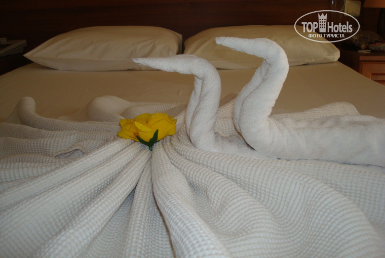 Отдыхали в отеле в конце августа - начале сентября 2011 года. В этом году решили поехать повторно. Летали Пегасом, к туроператору никаких нареканий. От аэропрорта дорога заняла где-то 1,5 часа. Заселили нас сразу, так как приехали мы часам к 5 вечера. Номер дали хороший, в корпусе с видом на основной бассейн и анимацию. Кстати, из номера была видна крыша, на которой вечернее диско и анимация проходила, когда все было лень, то мы прямо на балкончике устраивались и наблюдали)В номере тв, фен, минибар с напитками и шоколадками, швейный набор, блокнот, ручка, сейф, кондиционер. Чисто, опрятно, ничего не сломано.Полотенца меняли и убирались каждый день, за 1$ крутили лебедей и лепестками роз кровать осыпали)Территория у отеля небольшая, но уютная, особенно учитывая, что отель городской. Есть два больших бассейна и совсем маленький для детей.Расположение очень выигрышное: отель в центре Кемера, до пляжа 3 минуты ходьбы по парку, в парке фонтан, зелень, тренажеры, неплохой маркет, а также Бургер кинг для любителей. Пляж галька, с лежаками проблем не было, полотенца не брали - всегда свои берем. Говорят, что по утрам в море можно увидить больших черепах, но мы больше с утра у бассейна обитали, поэтому не видели.Море чистое, заход плавный. В отеле активная анимация: каждое утро гимнастика, водная гимнастика, водное поло, соревнования в бассейне, клубный танец. скучать не дадут 100% (были в отелях дороже, но с ооооченнь слабой анимацией, дико скучно и тоскливо). Вечером на крыше отеля камеди шоу и танцы. Видно ,что аниматоры работают и стараются. После 12 можно с аниматорами съездить в клубы Аура, Кристал, Инферно, заберут-привезут на автобусе, проведут в клуб. По поводу питания: на мой взгляд, очень достойно. Мы голодными не были никогда, много овощей в нарезке, салатов, сыр, булочки разные, различные варианты гарниров, мясо тоже без проблем брали и курицу, и индюшку, сладости очень вкусные. У бассейна днем пекут обалденные гезлеме с творожным сыром. Услугами баров особо не пользовались, только газированные напитки брали. Очень порадавала турецкая ночь: народные танцы, танцы живота, очень красиво пел молодой человек на русском языке. Очень много вкусностей, шашлык, торт, в этом году на фотках даже роллы углядела. Действительно празничное настроение. В Белеке, например, турецкая ночь была очень скудная, только верблюдов привели и ужин как всегда, никакого ощущения праздника, хотя отель классом выше.