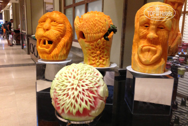 Столовая огромная,очень много десертов . Первый отель,где всегда были в наличие(каждый день) Арбузы,дыни,апельсины,яблоки трех видов,персики,нектарин,сливы,алыча,виноград,черешня. Всегда чистая посуда и столы,всегда можно найти место,очень вежливые официанты и бармены. Мясо было,рыбный день был,вкусное пиво. Минус,это дорогие соки,и они были только апельсиновые(а я люблю лимонный)(цена сока 3 долара)