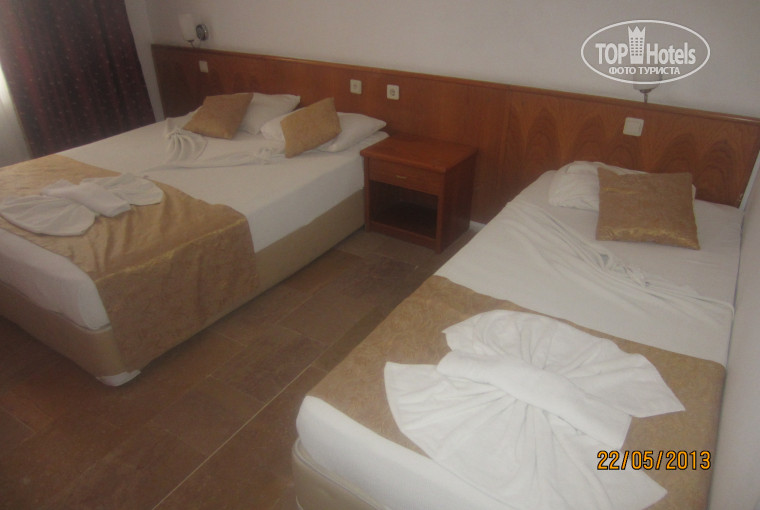Отдыхали с 22мая по 5июня,нормальный отель,стало заметно лучше чем в 2009! огромный плюс центр города все в пешей доступности, до моря 3-5минуты пешком, много магазинов и ресторанов. В отеле 2корпуса,у нас был 209номер в главном корпусе балкон выходил во внутренний дворик где находиться детская площадка, одна двухспальная и одна односпальная кровать,все работало,в душе было только 2кусочка мыла,фен есть,шампуня геля для душа нет,но это не великая проблема напротив отеля через дорогу есть маркеты и магазинчик А101,там все можно купить,очень удобно чтоб не везти с собой!оставляли чаевые-убирали хорошо,кто не оставлял уборкой тоже был доволен!отель находиться возле автовокзала(удобно для тех, кто путешествует сам)недалеко от отеля есть магазины Мигрос,ШОК,БИМ,на первом автобусе можно доехать до самого центра там есть порт, крепость, еще можно посетить аквапарк Дамлаташ, пещеру Дамлаташ и Лунапарк(у кого есть дети)!в принципе впечатление от отеля положительное! большая часть персонала приветливая,ресепшен тоже приветливый,деньги за заселение действительно вымогает,но не сам ресепшен, а носильшик багажа,который сидит в его отсутствие!в отеле своя баня и фотограф-хорошие фотки делает!до моря минут 3-5,пляж песочек,заход в море удобный!питание можно оценить на 4+ для 3звезд,единственное это мало фруктов,а точнее небольшое разнообразие!