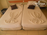 В номере:Номер нам дали очень хороший,солнечный.В номере было две кровати сдвинутые к друг другу,шкаф,туалетный столик,кресло,таршер,телевизор с двумя русскими каналами,кондиционер(работал отлично),холодильник,сейф(платно мы не брали).В ванной комнате вылажена красивая плитка, зеркало,раковина,туалет,ванная,фен.На балконе два стула небольшой столик и сушилка для вещей.Одним словом номер был вполне уютный.