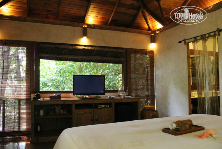 Номер TreeTop Chalet очень милый. Тщательно продуманный интерьер: без роскоши, но комфортный. И лёгкая потёртость его не портит. Домик стоит прямо на склоне горы, густо поросшей растительностью.