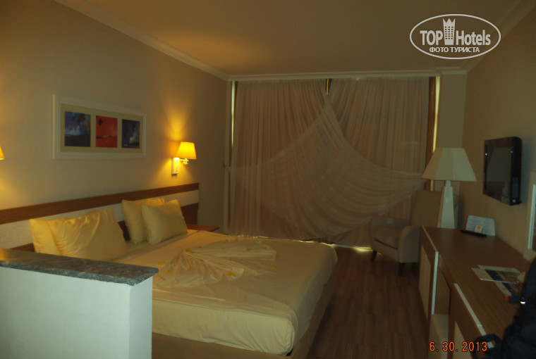 2. Номер достойный, естьвсе необходимое: холодильн к, бесплатный бар, фен, тапки одноразовые, халаты (правда оба размера 46, так что на мужа не налез :)), мыло, шампунь, гель, бальзам, ватные диски и палочки.. Кстати отель поздравил нас как молодожонов (наверно из-за разных фамилий, а я просто паспорт не успела поменять). Шампанское, бокалы, фрукты, сладости и открытка - малочь, а приятно)))) Единственный минус - подушка. Она такая жестная и неудобная, что мнеприходилось спать либо без нее, либо на полотенце. Модно было взять другую, но за 3 доллара за сутки, кажется. Но это кто как любит.