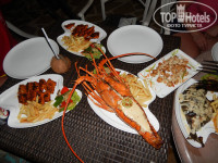 Прямо в отеле,рыбу купленную в Маргао(на мотобайке 13 минут езды), отдалави в отеле шефу готовить. Цена порадовала: за один лобстер 1,5кг, 2 кг креветок, одна небольшая рыбка, одна акула, 1 кг кальмаров отдали 900 рупий(15$)-есть на фото. Приготовили классно! Сидели за столиком около бассейна!