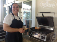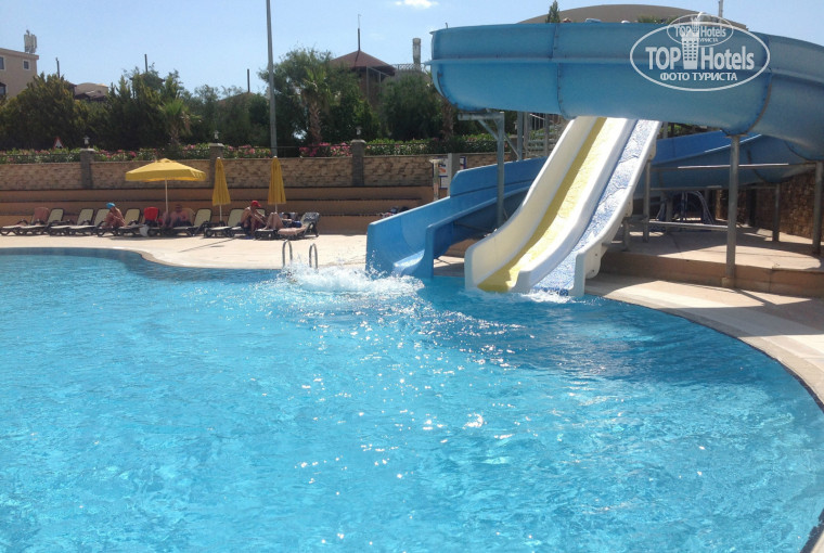 ( хотя для Турции, которая всегда славилась выпечкой - это удивительно) два вида хлеба белый и черный. Чай и кофе на террасе. Есть в пакетиках, а есть черный турецкий в чайниках. ( рекомендую) На террасе можно курить. Обед: Супы – вкусные все! Много зелени и овощей, есть салаты. Гарнира три: макароны, пюре и рис. Со вторым посложнее – выбор ограничен. Курица ( как правило ножки, даже не бедрышки), Тушенные головы рыбы, которые ужасно воняли и овощное рагу в котором если вам повезет, можете выловить манюсенькие кусочки мяса. Обед очень слабенький. Ужин: Сидя на лобби баре вы можете через стекло наблюдать как готовиться наконец то на гриле что то вкусное, запах соблазняет. В 19-00 начинаются очереди, причем за всем: за грилем, за тем, чтоб занять столик, но самая большая очередь за напитками. В этом отеле официанты не обслуживают. Если вы хотите выпить или просто попить, то вам нужно подойти к барной стойке выстоять очередь минут 10, чтоб получить свой бокал пива или воды. Поэтому мы приходили позже и тогда…. Мы видели остатки соусов от блюд приготовленных на Гриле, хотя до окончания оставалось еще полтора часа. Приходилось кушать то что приготовлено на обычной плите – это было в достатке. Но, зато были свободные столы и не было очереди в бар, так что нужно выбирать. И основные моменты в заключении. Вся еда не соленная, не перченая и в целом пресная (так как рассчитана на детей) Но возле хлеба стоят специи, очень много и разных, так, что делайте блюдо на свой вкус. Выбор фруктов и выпечки для 5* очень маленький. Яблоки, груши, порезанный апельсин и иногда порезанный грейпфрут. Так, что через дорогу на базарчик – там есть все.