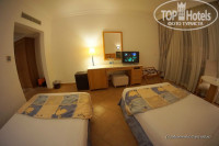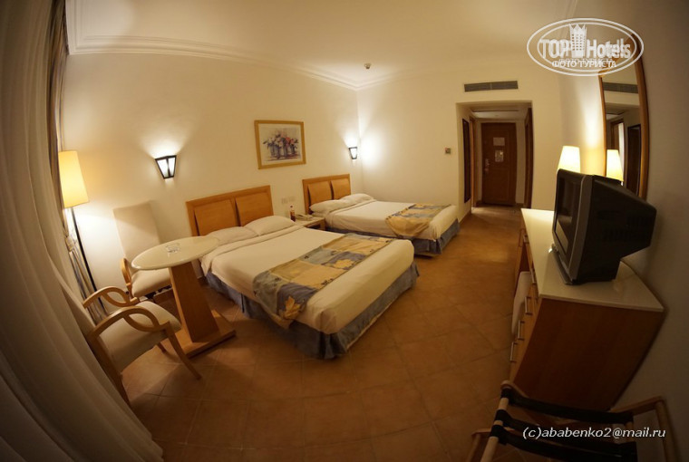 Покупал самый дешевый - стандартный номер. При заселении подарил "Аленку" и получил номер с боковым видом на море - 6138. Желающие иметь вид на море могли официально в кассу заплатить по 10 баксов за сутки или не официально заплатить 30-40 баксов (слышал о таких случаях). Для меня вид из окна не принципиален. Сидеть на балконе не с кем. Балконную дверь ни разу не открывал и шторы всегда держал закрытыми. В номере никаких насекомых не было. Холодильник оказался не исправным, по моему заявлению в тот же день его поменяли на исправный. Горячая вода была всегда. Хорошо то, что ежедневно уборщик приносил в комнату по две бутылки 0,5 л воды. Полотенца также менял ежедневно. Телевизор показывал три русских канала - Первый, Россия 24 и Планета РТР (всего около 25 каналов). Освещение в номере на мой взгляд не достаточное. Торшер слабо помогал. Любителям почитать плохо, для остальных будет нормально. Вид номера есть на моих фотографиях. Дизайн номера простоватый, без изысков. В Хургаде (GRAND RESORT 5*) номера посимпатичнее. Сейф в номере был исправный и бесплатный. Дорога к морю занимала 4,5 минуты.