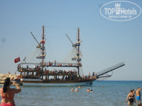 -брали прогулку на яхте, стоящей на пляже слева (Calypso VIP). На меня и ребенка 10 лет обошлась в 25$, ребенок 2 лет – бесплатно (а вообще стоит 20 – взрослый и 10 детский). Обед включен, напитки за плату. Прогулка в общем-то стандартная, по времени рассчитана до 16,00 или раньше/позже в зависимости от погодных условий. Сначала часа 1,5 плывем, потом стоянка на полчаса на «косе», с одной стороны которой холодная вода с пресной водой, а с другой – Средиземное теплое соленое море, потом обед (рыба или курица с овощным салатом), далее на выбор – или 2 часа на рынке в Манавгате или поездка на водопады (и туда, и туда перевозят на автобусах). На обратном пути – купание в море с прозрачной бирюзовой водичкой. На яхте никто по-русски не говорит, кроме фотографа. Вся информация на немецком, но в принципе все понятно) Фотографии на яхте стоят 5$ за штуку, но если брать все, то можно сторговаться. Ребенок отказался фотографироваться и 7 фото для нас обошлись в 20$. Мы в отеле были в 16.30, хотя в те дни, когда наблюдали с берега за яхтами, они прибывали гораааздо раньше)