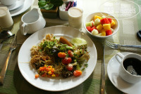4. ЗАВТРАКИ – пища очень вкусная, но меню преимущественно вегетарианское. Думаю, мужчинам голодно было. Для нас из-за разницы во времени это был не завтрак, а скорее обед. В 8 контейнерах с горячим: рисовый суп, рис с овощами, лапша или вермишель с овощами, овощи в соусе, сосисочки, ветчина, жареный бекон, оладушки или сухие гренки. Дальше стол с Овощами для салата и к ним соусы. Нарезка колбаски и сыра. Из фруктов – арбуз и ананас, позже появился фруктовый салат с разнообразием фруктов, иногда бывал драгон-фрукт или дыня. Омлет и яичница. Хлеб и кексы с джемами, масло. Что-то для детей было. Самое приятное - были два-три вида смузи. Самое вкусное блюдо – шпинат в сливочном соусе и паровая рыба оформленная в виде суши (вместо рисового супа).